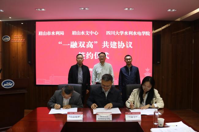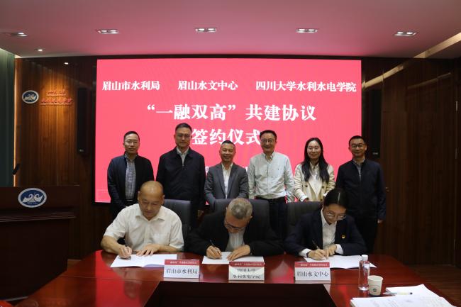 与眉山市水利局、眉山水文中心签署“一融双高”共建协议。院长杨兴国,副院长谢红强,眉山市水利局党组书记、局长史跃平,眉山水文中心党总支委员、副主任李琴以及三方相关人员出席签约座谈会。51吃瓜网党委书记吴刚主持会议。